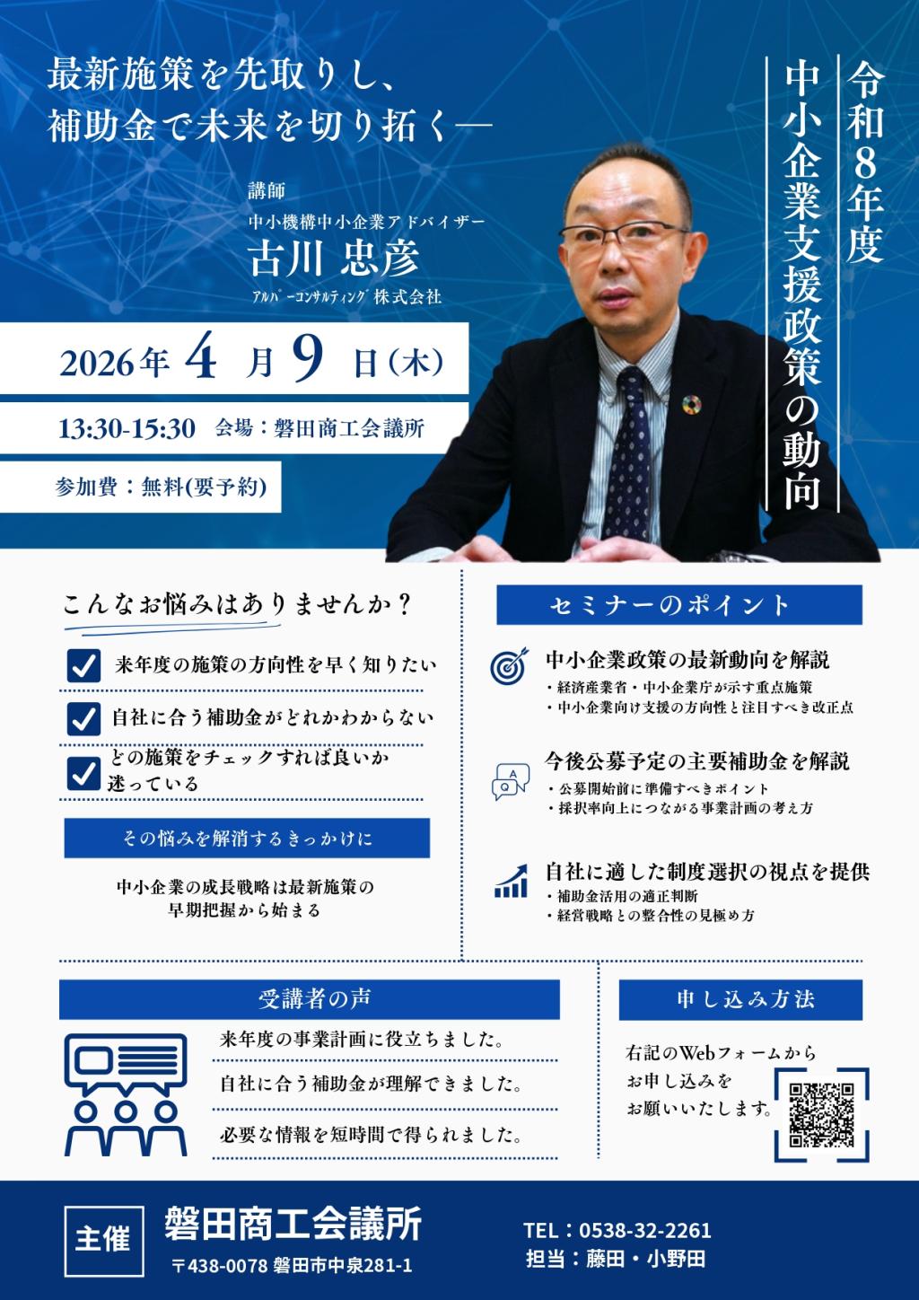 本セミナーでは、令和8年度の中小企業支援政策について、最新の方向性と実務に役立つポイントを分かりやすく解説します。